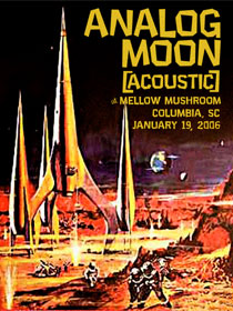 Moving right along… This weekend should be great for you Columbia area Analog Lunar-tics. I promise to never call you that again….maybe. Anyhoo, Analog Moon will be appearing not once, but twice this weekend in the capitol city. On thursday night, we will be eating pizza pies and playing your favorite Analog Moon songs at Mellow Mushroom in the Vista (more on this later). Friday night will be spent recovering, but saturday we will return to the Vista to play a set supporting The Dave Britt Band at Art Bar.
